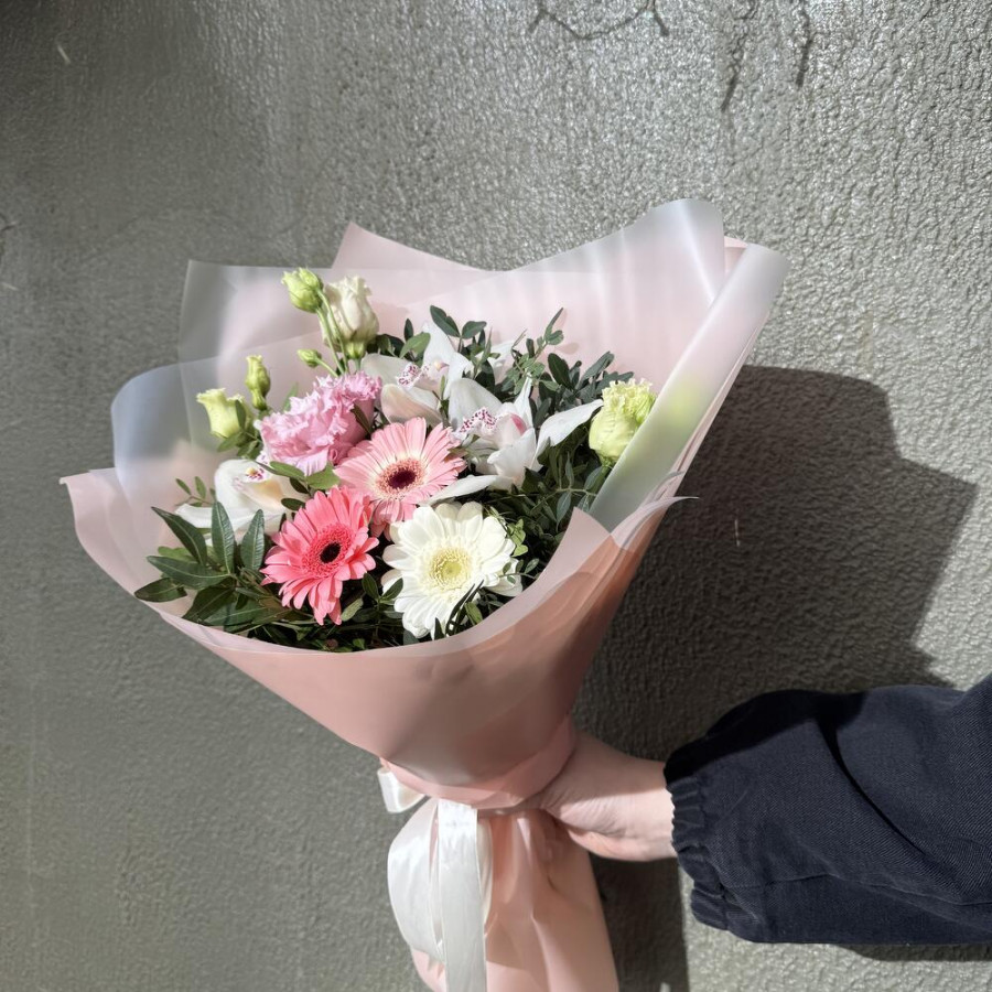 На фото букет «нежный роман». В составе: орхидея 3 шт, эустома (лизиантус) 1 шт, гербера 3 шт, писташ 5 шт, дизайнерская упаковка 1 шт, атласная лента 1 шт, . Все цветы свежие и ароматные, букет красиво оформлен и отлично подходит для подарка. Доступна доставка цветов или самовывоз.